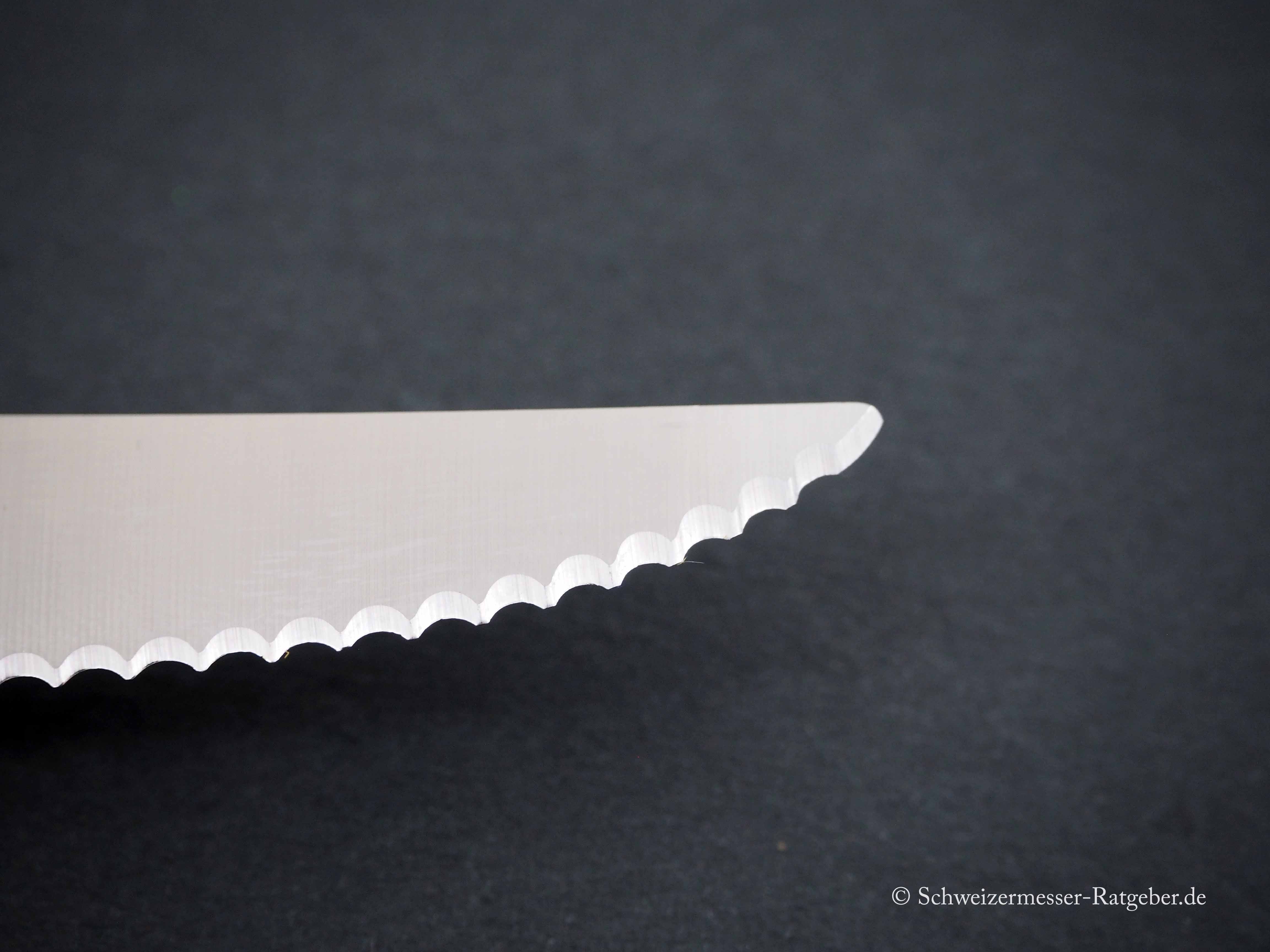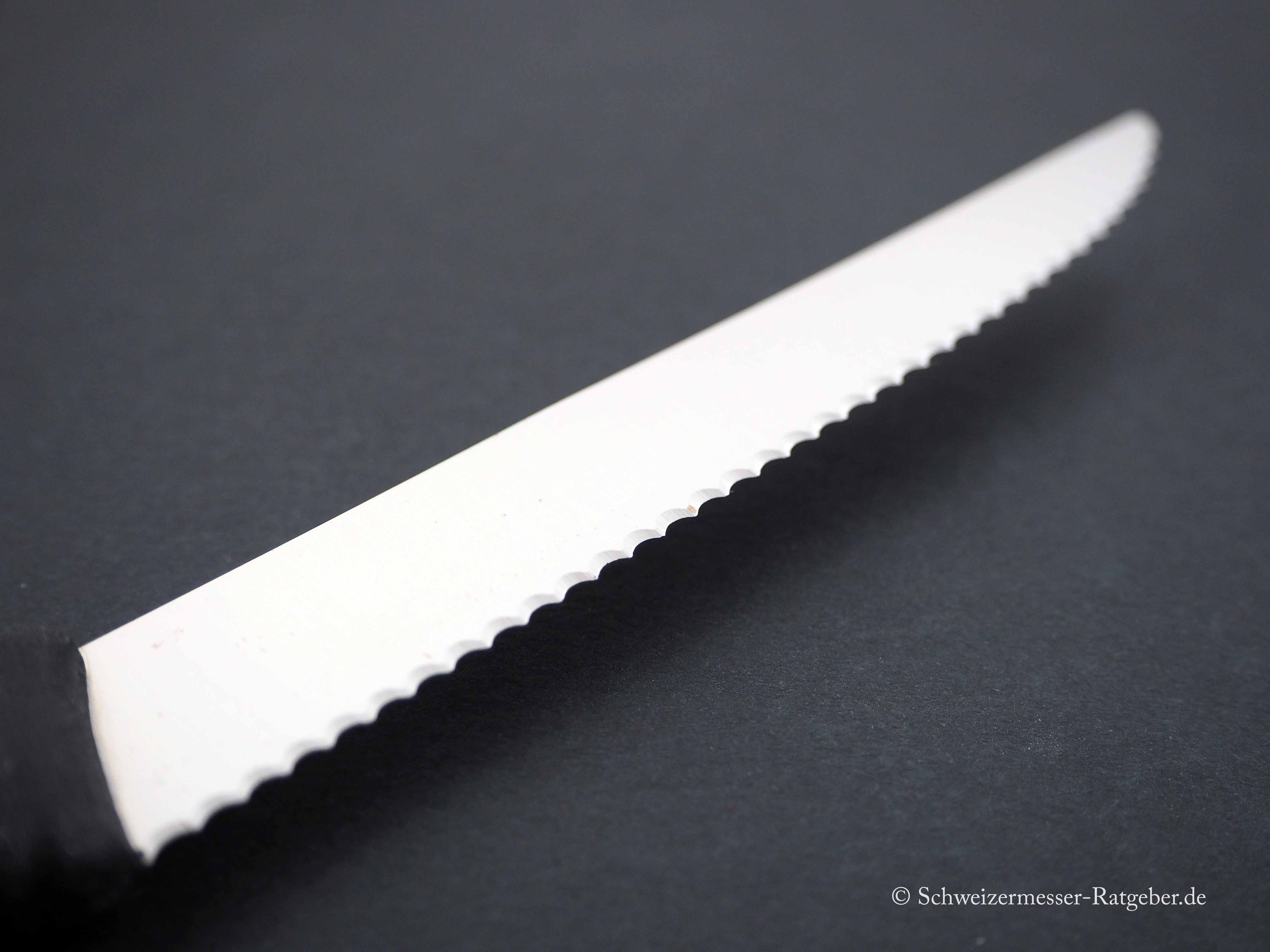 Bei der Klinge wird rostfreier Stahl verwendet, welcher nicht völlig starr, sondern etwas biegsam ist. Durch den extrem scharfen Wellenschliff und die spitze Klinge ist dieses Messer für verschiedenste Einsätze bestens geeignet. Auch wenn der Hersteller von einem ➤ Steakmesser spricht – es ist so vielfältig einsetzbar, dass es auch ein universales Küchenmesser genannt werden könnte. Aus eigener Erfahrung kann ich sagen (und die vielen begeisterten Kundenrezensionen bestätigen das), dass dieses Messer einfach alles schneidet, sei es weiches Fleisch oder gegrilltes Steak, Brot oder Brötchen, Gemüse oder Obst, Salat oder Käse … oder selbst eine Pizza mit hartem Teig! Es sind dabei präzise Schnitte bei nur leichtem Druck möglich. In den meisten Fällen schneidet man wie durch Butter – dies funktioniert dank dem extra scharfem Wellenschliff. Besonders von Vorteil ist dies beispielsweise bei Tomaten: Durch die Sägewirkung schneidet das Messer ideal durch die zähe Fruchtschale ohne diese zu zermatschen, was häufig bei stumpfen Klingen passiert.
